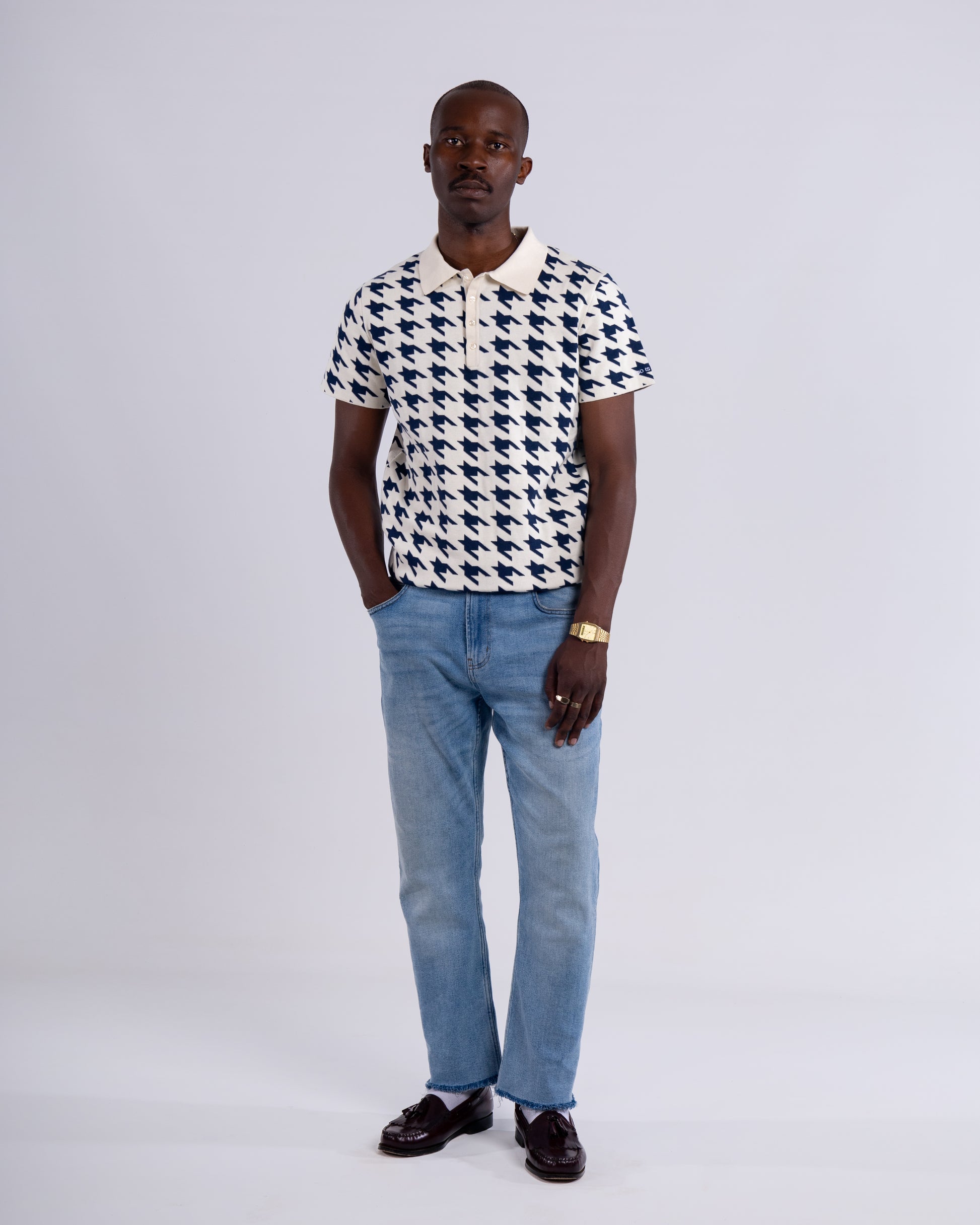 Introducing a piece from our Grace Collection: the Houndstooth Knitted Polo. Crafted with meticulous attention to detail, this exquisite piece seamlessly blends sophistication with comfort, offering the discerning gentleman a timeless wardrobe essential.